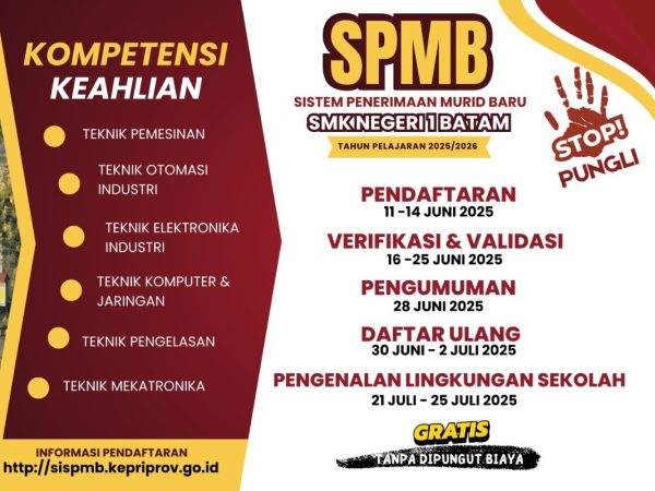 SMK Negeri 1 Batam membuka Penerimaan Murid Baru (SPMB) untuk Tahun Pelajaran 2025/2026 sesuai ketentuan dari Dinas Pendidikan Provinsi Kepulauan Riau. Proses pendaftaran dilakukan secara online dan terpusat melalui laman..