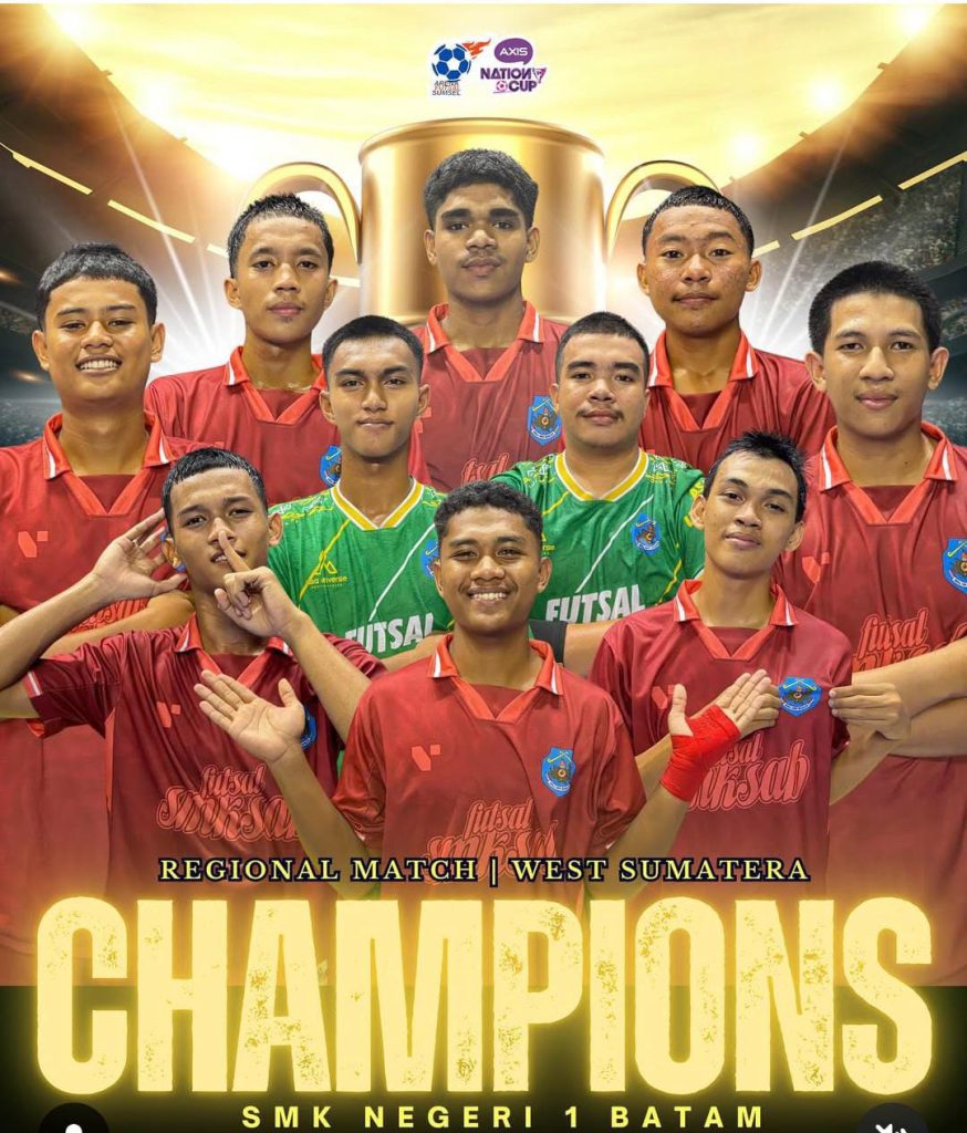 Team futsal SMKN 1 Batam berhasil meraih juara 1 dalam kompetisi Futsal AXIS National Cup 2025 Regional Sumatera setelah mengalahkan 8 sekolah perwakilan dari masing-masing Kota di Sumatera. Prestasi yang sangat membanggakan ini diraih oleh Team Futsal SMKN 1 Batam yang di Bimbing Oleh Pak Andra dan Pak Eko, dengan ketekunan latihan dan kerja keras, mereka mampu melanjutkan ke tahap selanjutnya mengalahkan 396 tim sekolah se-Sumatera. ini membuktikan, bahwa SMKN 1 Batam bukan hanya terbaik di LKS Nasional hingga mampu menuju ke WorldSkills ASEAN Competition tahun 2025 di Filipina, namun SMKN 1 Batam mampu mendobrak Team Futsal ke Kancah Nasional melalui, Ajang bergengsi Axis National CUP 2025. Tentunya ini sebagai Kado Terbaik Bagi Kepulauan Riau Khususnya bertepatan dengan Hari Jadi ke-23. Mari kita doakan Bersama agar Team Futsal SMKN 1 Batam yang akan bertanding di Grand Final AXIS National CUP 2025 di Istora Senayan Jakarta, Pada Sabtu 11 Oktober 2025 mendatang diberikan kesehatan, kelancaran dalam proses menuju Grand Final dan tentunya mampu menunjukkan semangat juang “Sang Juara”.